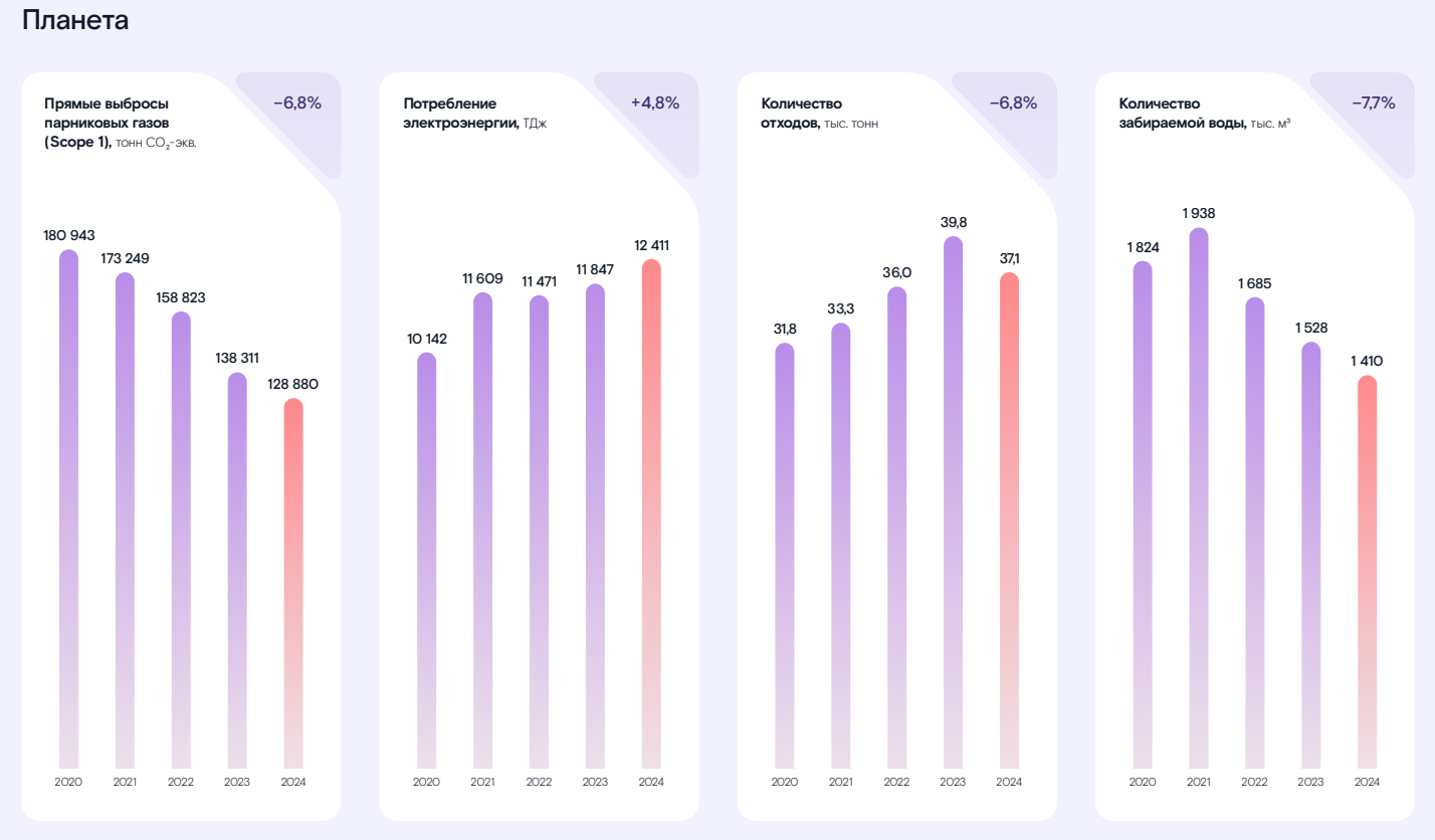 Объем затрат на природоохранные мероприятия составил 213 млн рублей, на 3% больше, чем в 2023 году. “Моему следу” как экопроекту всегда хочется видеть цифры больше, но с учетом экономической ситуации в стране, это неплохо. 84% от всех расходов идет на обращение с отходами, наибольший рост в 2 раза шел в направлении охраны атмосферного воздуха и предотвращение изменения климата.