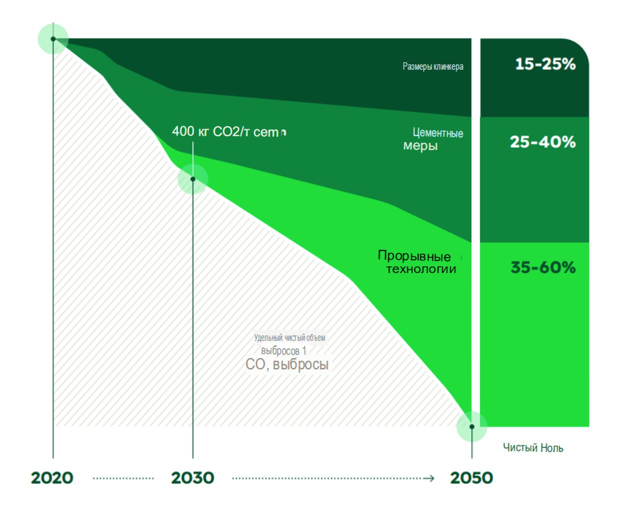 Для достижения цели компания внедряет меры на нескольких уровнях: при производстве клинкера т.е. промежуточного продукта, при создании цемента и утилизации продукции. Среди перечисленных направлений экологизации мы можем увидеть как универсальные: энергоэффективность установок, использование альтернативных источников энергии, улавливание, утилизация и хранение углерода, так и специфичные меры, связанные с использованием альтернативных видов клинкера и поиска революционных технологий для сокращения его вреда.