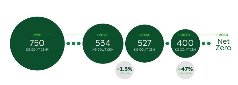 Как мы видим в целях Heidelberg Materials они планируют снижение удельных выбросов до 400 кг уже к 2030 году. В 2024 году снижение составило 1,3% или 527 кг на тонну цемента.